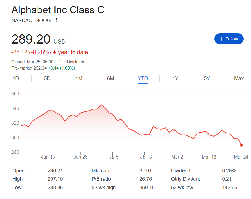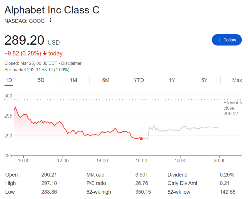 March 24 proved the worst stock market session Google (NASDAQ: GOOGL) experienced since June 2025 as Alphabet shares plunged 3.28% from $299.02 to $289.20 between the morning and closing bells.