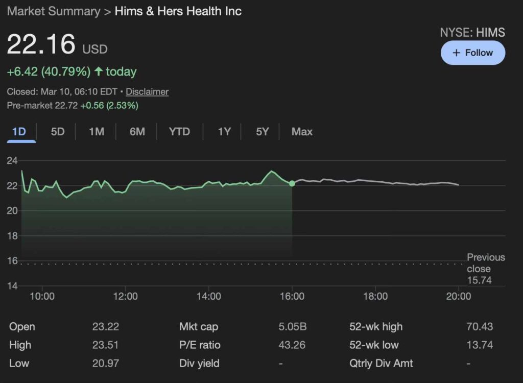 24-hour HIMS stock price. Source: Google Finance