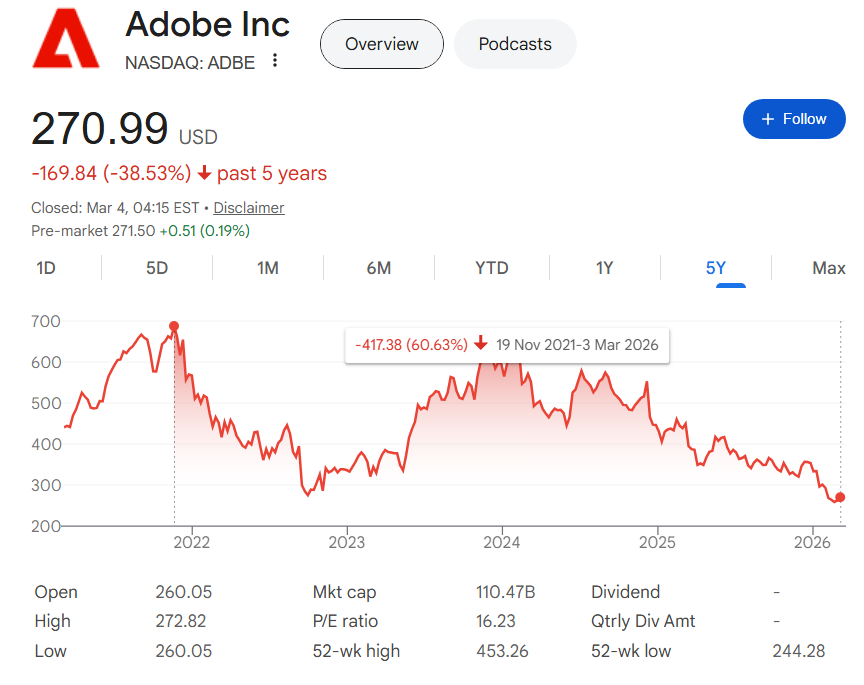 Overall, the five-year chart reveals Adobe stock is down 38.53% through the period and, with its latest closing price of $270.99, it is more than 60% below the 2021 highs.