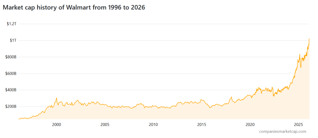 Walmart stock valuation chart since 1996. Source: CompaniesMarketCap
