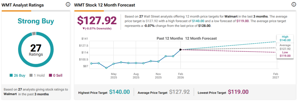 Equally noteworthy is that both price forecast revisions made in February – those issued by Piper Sandler and Evercore ISI – essentially expect WMT to trade sideways in the coming 12 months, as the analyst predicted a climb to $130 – just $2 above the latest close.