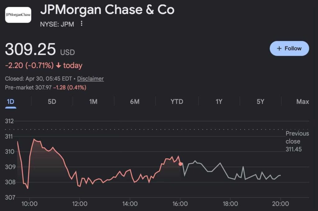 Currently, JPMorgan shares are down approximately 1.5% in the last five days and nearly 5% on the year-to-date (YTD) chart.