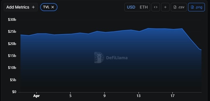 The Ethereum network was the worst hit after the KelpDAO attack, with its TVL declining by $10.34 billion, in two days, to hit approximately $46.16 billion at press time. Furthermore, the TVL on AAVE (AAVE), a top multi-chain lending protocol, fell to its lowest level in 2026 at reporting time, to about $17.51 billion, down from $26.39 billion on April 18, as indicated on DeFiLlama.