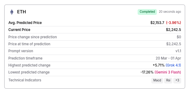 Notably, Finbold’s AI prediction agent has generated an average ETH price of $2,153 on April 1, 2026, which translates to a -3.54% downside, given that the digital currency is currently changing hands at $2,242.