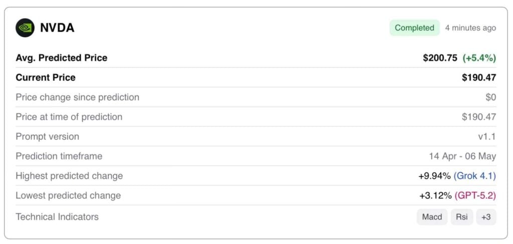 Finbold’s AI prediction agent, combining the outputs from Gemini 3 Flash, ChatGPT 5.2, and Grok 4.1, projects an average Nvidia share price of $200.75 on April 30, 2026. The figure suggests a 5.4% upside from the current price of $190.47.