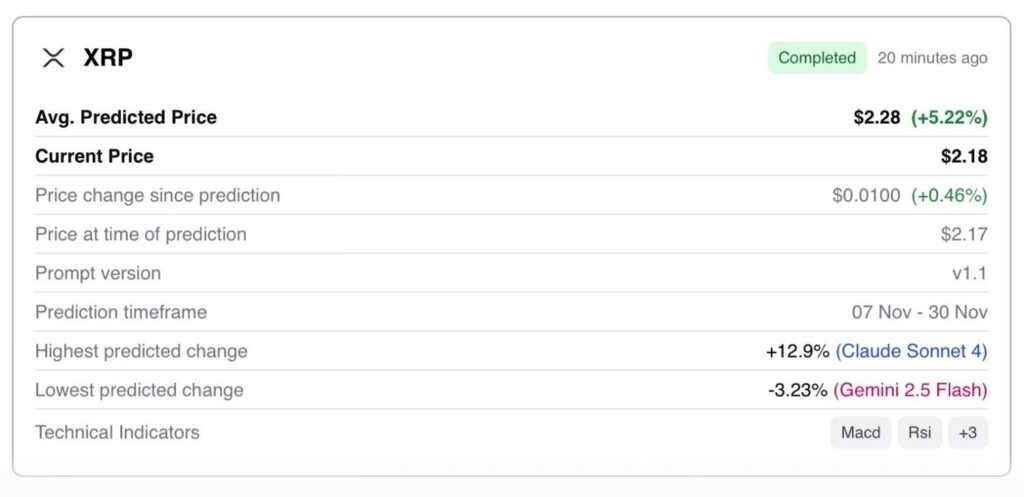 With traders speculating on how the asset might move in the following days, Finbold turned to its AI prediction agent to see where XRP might stand by the end of the month. According to the forecast, the asset is only witnessing a short-term correction, being set to recover 5.22% and trade at $2.28 by November 30.