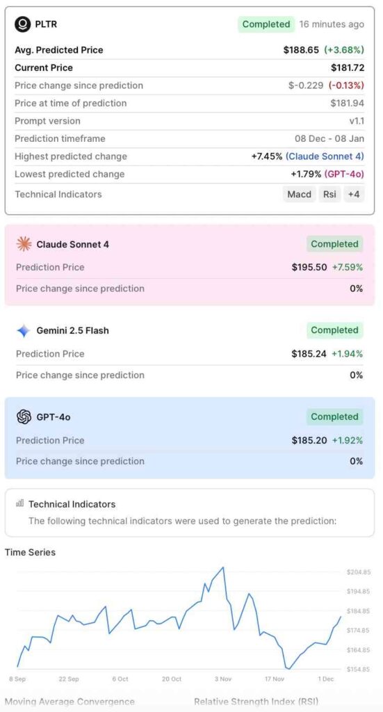 The average prediction from ChatGPT, Gemini and Claude for January 8, 2026 is $188.65, which indicates a 3.68% rise from current levels. Claude Sonnet 4 provided the most bullish outlook at $195.50, pointing to a possible 7.59% gain, while GPT-4o returned a more cautious $185.20 target, suggesting a 1.92% move higher. Each model reflects improving technical conditions following a brief pullback in November.