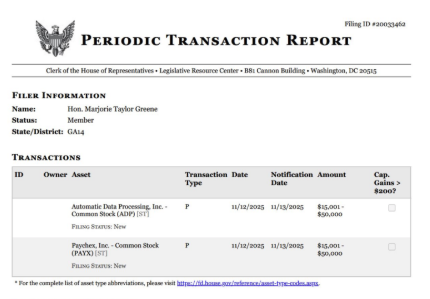 In a filing submitted on November 13, 2025, Greene revealed she bought shares of Automatic Data Processing (ADP) and Paychex (PAYX) on November 12, with each purchase valued between $15,001 and $50,000.
