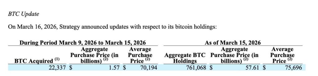 The firm, led by executive chairman Michael Saylor, acquired 22,337 BTC between March 9, 2026 and March 15, 2026, an acquisition worth roughly $1.57 billion, according to a filing released on Monday, March 16.