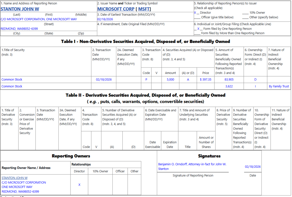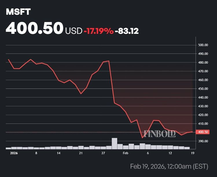 After falling 17.19% in 2026 to its February 19, press time price of $400.50, Microsoft (NASDAQ: MSFT) stock received a welcome show of confidence in the form of a board member executing a $2 million purchase.