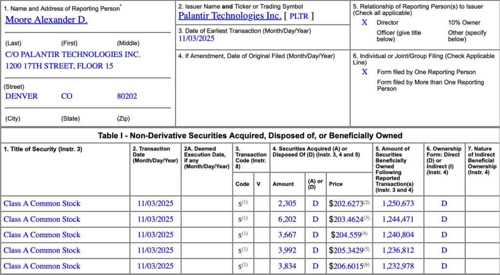 Palantir director and early employee Alex Moore has sold approximately $4.1 million worth of Palantir Technologies (NASDAQ: PLTR) shares, according to a Form 4 filing submitted to the U.S. Securities and Exchange Commission on November 3, 2025.