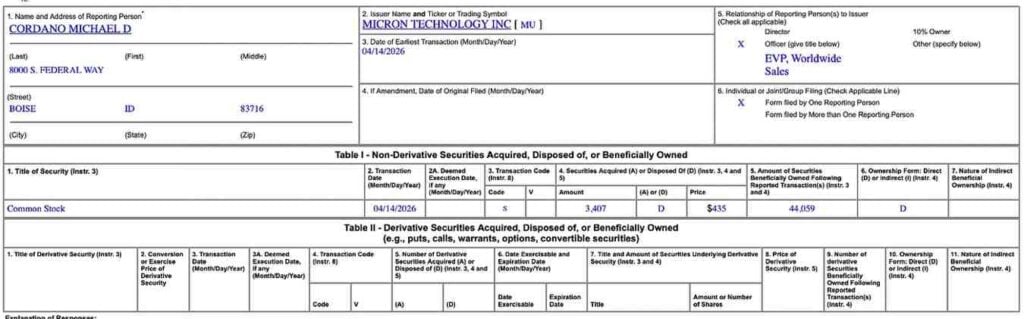 Cordano’s move was an isolated incident. Notably, Sumit Sadana, Executive Vice President and Chief Business Officer at Micron Technology, had sold 24,000 shares of the company’s common stock just days prior, on April 10, 2026, according to another Form 4 filing.