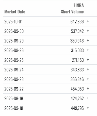 But the picture isn’t quite as simple as “Musk tweets, shorts pile in.” On Oct 1, FINRA tracked 1.59 million total off-exchange shares, putting the short-volume ratio at 40.48%. That’s actually lower than Sept 30’s 44.32%, meaning short trades rose in absolute terms but were diluted by even heavier overall trading.