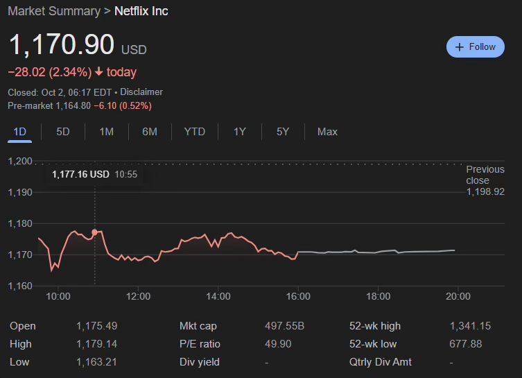 Amid all the drama, NFLX shares have fallen further down, dropping another 2.34% yesterday (-$28.02) and seeing an additional 0.52% (-$6.10) dip in pre-market at the time of writing, when they were sitting at $1,164.80.