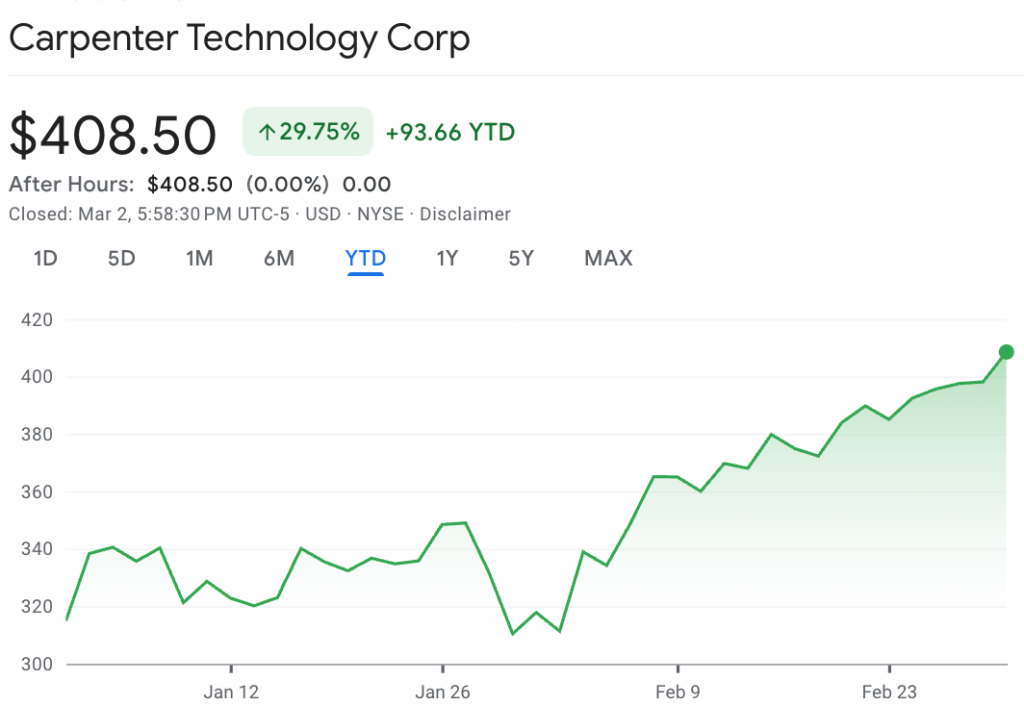 Carpenter Technology produces high-performance alloys used in armored vehicles, aircraft, helicopters, missiles, and other military equipment. In 2026, CRS stock has rallied over 20%.