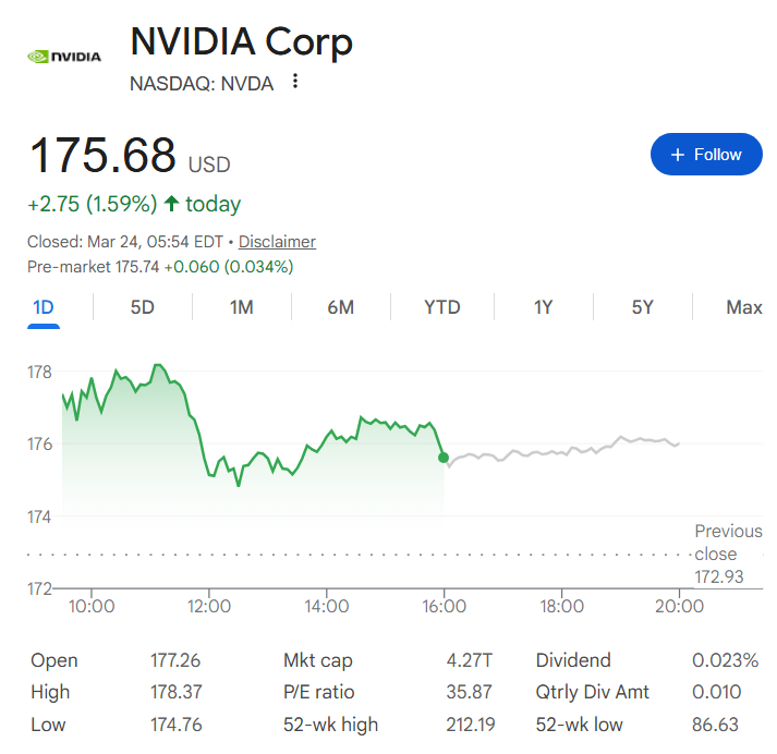 Similarly, the extended session leading to March 24 had, by press time, only a limited impact, considering Nvidia stock is up just 0.034% and changing hands at $175.74.