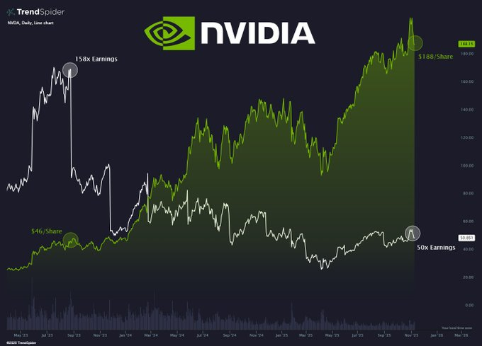 The chipmaker’s stock has surged from roughly $46 per share in 2023 to around $188, even as its valuation multiple compressed from 158x to 50x earnings, a rare and powerful combination in equity markets.