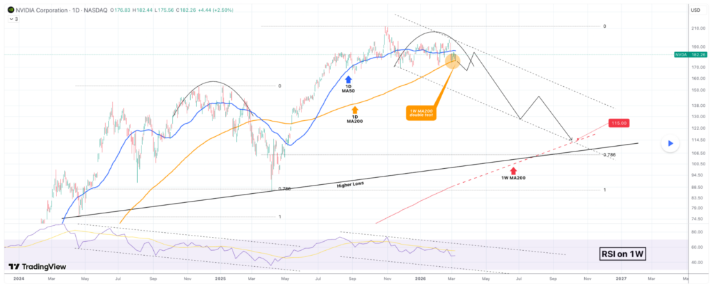 A long-standing higher-lows trendline has supported Nvidia’s uptrend for two years and is now converging with the 200-week MA, creating a potential long-term support zone if a deeper 2026 correction unfolds.