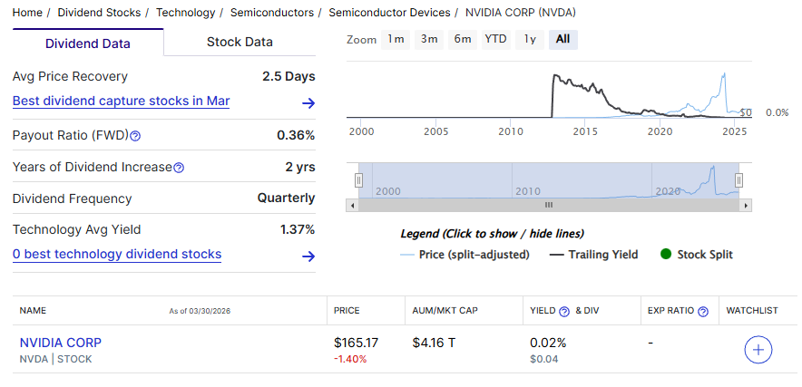 With shares trading at about $165 at the time of writing, Nvidia has a forward dividend yield of roughly 0.02%, significantly below the 1.37% average yield for the technology sector.