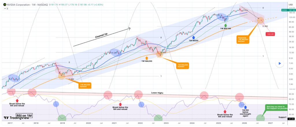 The analyst added that Nvidia recently tested a lower-highs zone near the channel’s upper boundary before pulling back sharply. The monthly RSI shows a clear bearish divergence, with momentum failing to confirm new highs, a pattern that has previously marked the end of bullish legs.