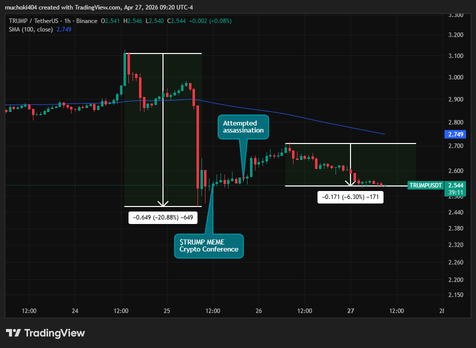 Official Trump (TRUMP) broke below a multi-week buy wall after an individual attempted to assassinate President Donald Trump on Saturday, April 25.