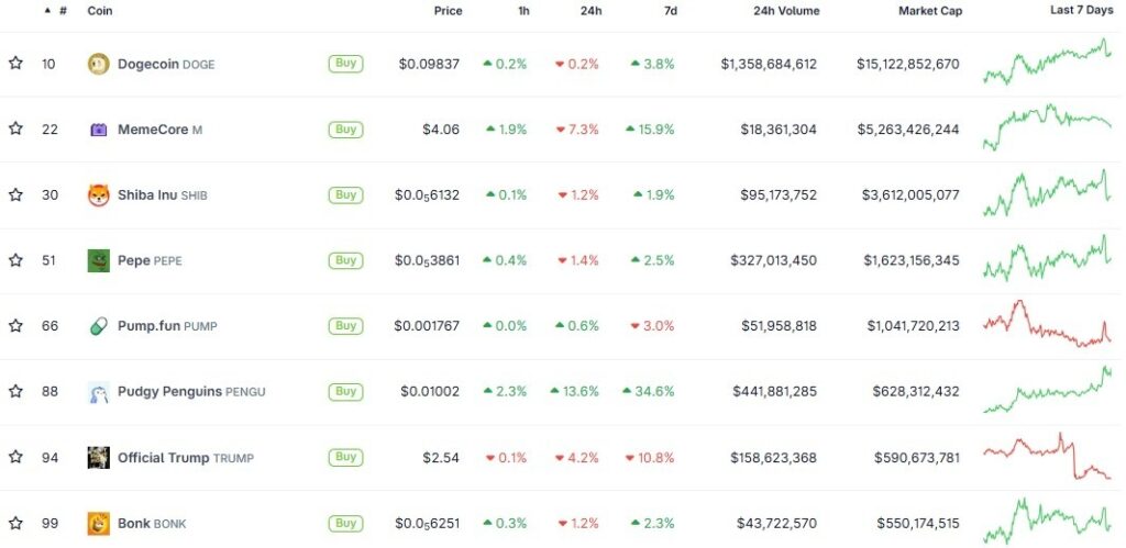 Performance for the top 8 memecoins by market cap. Source: CoinGecko