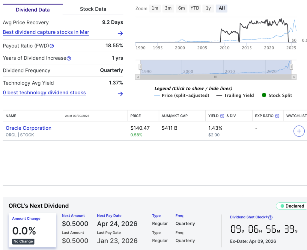 For investors, a holding of 100 ORCL shares will generate $50 from the April payout. On an annual basis, the same position would earn $200 in total dividends, assuming the current rate is maintained across all four quarterly payments.