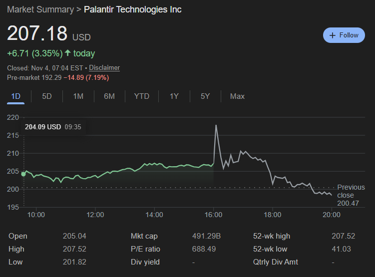 Palantir (NASDAQ: PLTR) closed at a record $207.18 on Monday, November 3, rising 3.35% following a strong third-quarter earnings call that reinforced its rapid growth across both government and commercial markets.