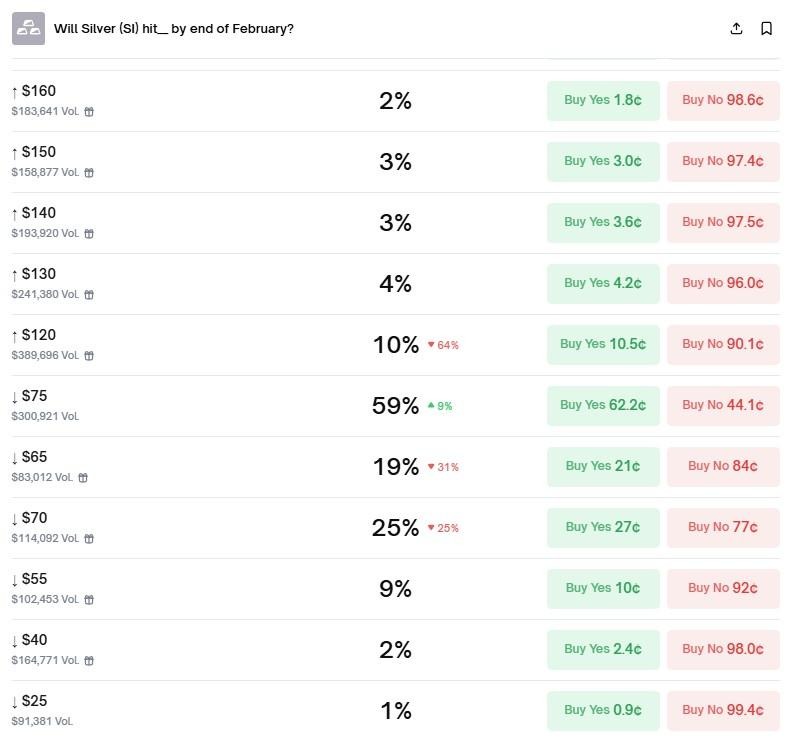 Silver is most likely to touch $75 at some point in the month, with odds of 59%, per the data Finbold retrieved from Polymarket.