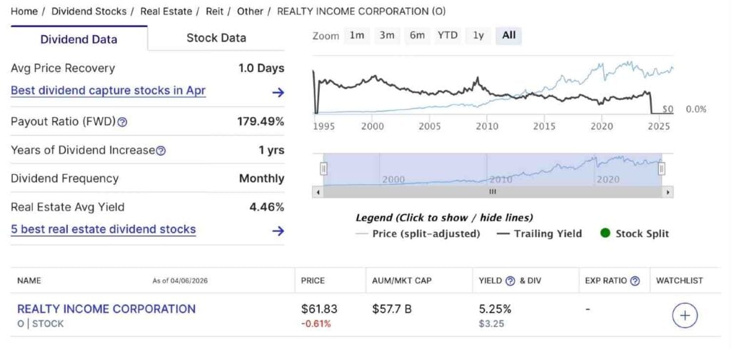 Realty Income dividends. Source: Dividend.com