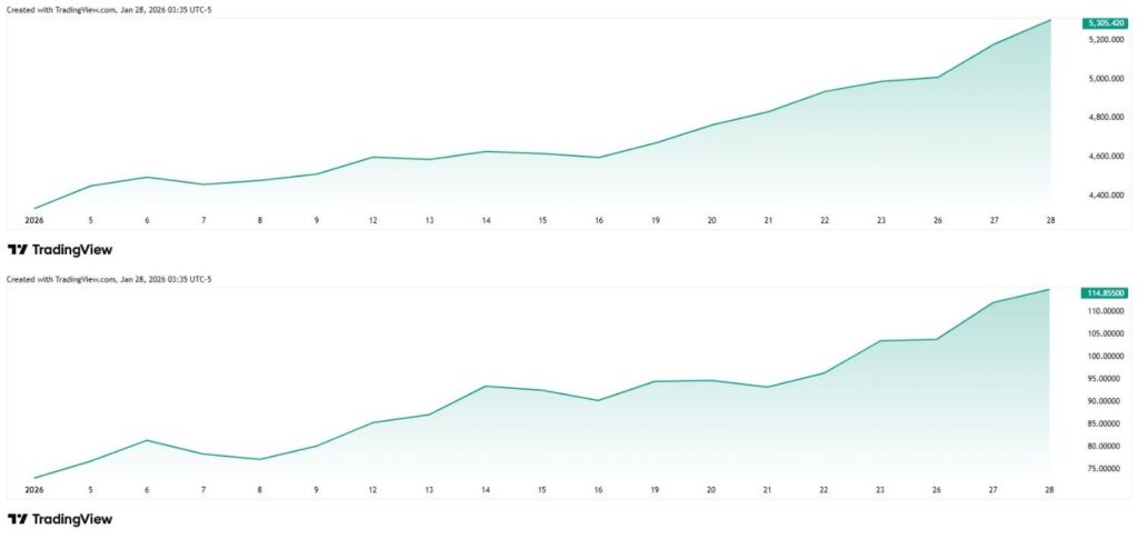 Notably, gold and silver have been gaining value at a record pace since 2026 started and are at all-time highs (ATH) of $5,305 and $114, respectively.