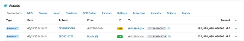 After receiving May’s 150 million, Ripple’s destination account rP4X2…sKxv3 kept 50 million and sent 100 million XRP to rhWt2…E32hk. Notably, this is a usual path for the company’s dumps, following a similar pattern to previous months.