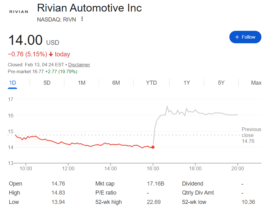 Between the overall state of the EV market and the figures Rivian posted, it is not particularly surprising that RIVN stock first fell 5.15% during the February 12 session from $14.76 to $14, but then soared 19.79% in the pre-market to its press time price of $16.77.