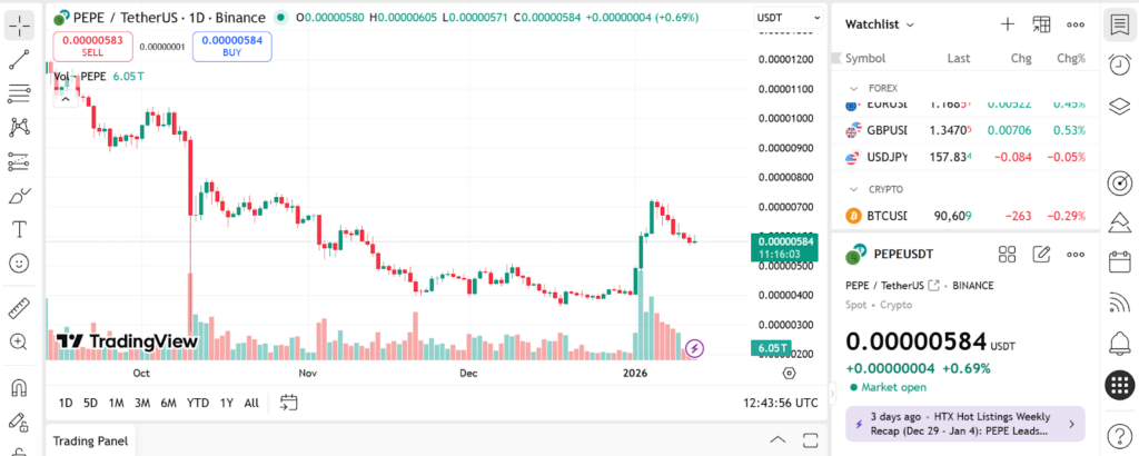 Over the last week, Pepe coin has traded in a tight band after earlier sharp moves, with traders watching the $0.0000055 area as support and eyeing $0.0000059 as the next resistance area flagged in recent memecoin roundups.