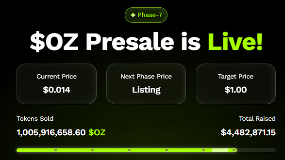 Ozak AI (OZ) is taking the crypto world by storm, not through memes or community hype, but through technological revolution. By integrating artificial intelligence, predictive analytics, and blockchain automation, Ozak AI aims to build the intelligence layer for the decentralized web. Currently in its 5th OZ presale stage at $0.0014, Ozak AI has already sold over 1 billion tokens and raised more than $4.4 million, underscoring massive early investor confidence.