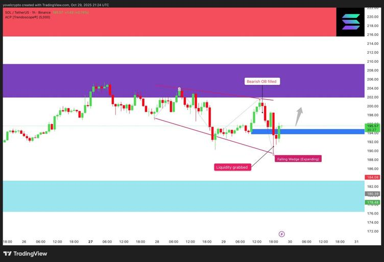 Solana (SOL) has just filled a bearish order block near $202 before dipping into the $194 demand zone, a move that’s drawn the attention of technical traders watching for a potential shift in momentum. The chart now shows an expanding falling-wedge pattern, often seen ahead of bullish reversals, as liquidity was grabbed at the lower wick. A confirmed break above the wedge and demand zone could trigger a strong recovery rally, with targets sitting between $210–$212. Traders are advised to keep a tight stop-loss below $187 to manage risk, as the setup looks primed for a possible upward continuation if buying volume increases.