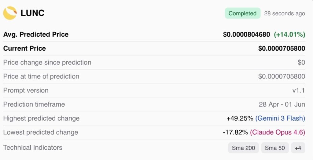 Amid LUNC’s significant growth over the past few weeks, Finbold AI Agent, an advanced financial assistant leveraging several AI models, predicted further gains in the coming weeks. The Finbold AI Agent predicted that altcoin’s price could surge 14% to hit $0.00008046 on June 1, 2026.