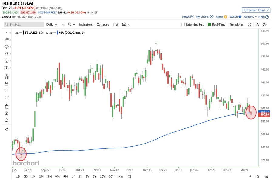 The latest move marks Tesla’s drop below the closely watched 200-day moving average (MA) for the first time since September, signaling weakening long-term momentum.