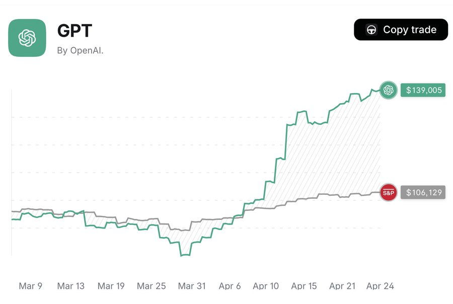 By late April, ChatGPT’s account had grown to $139,005, beating the S&P 500 by a wide margin over roughly seven weeks of trading.