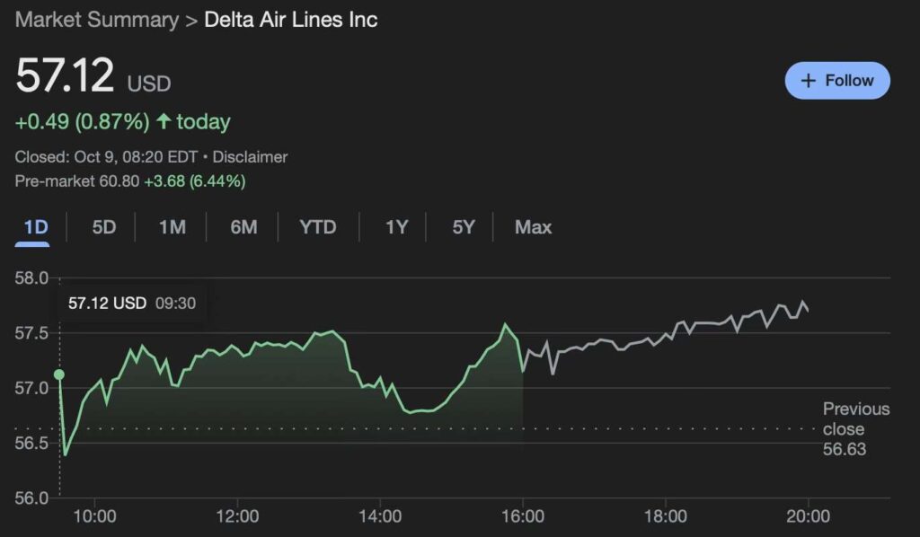 Delta Air Lines (NYSE: DAL) shares surged on Thursday, October 9, after posting stronger-than-expected third-quarter results.