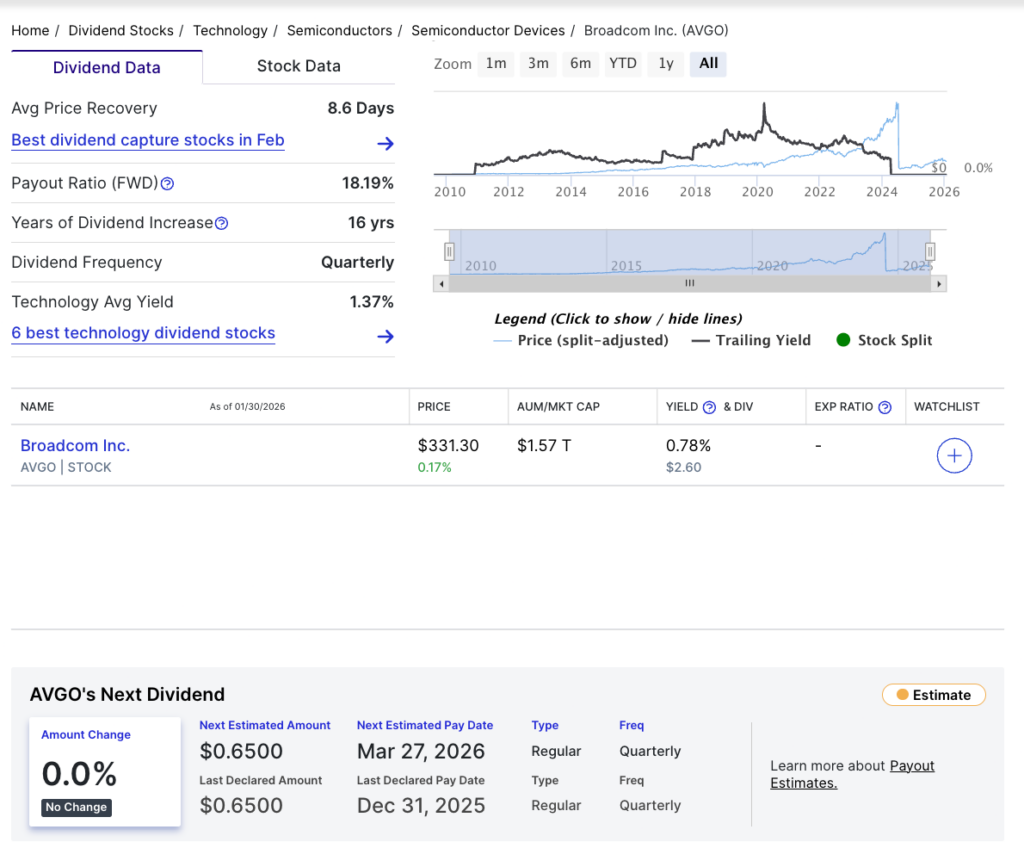 The company’s next quarterly dividend is estimated at $0.65 per share, with an expected payment date of March 27, 2026. The payout is unchanged from the dividend paid on December 31, 2025, signaling stability in Broadcom’s shareholder return policy.