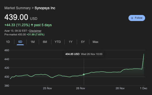 The announcement sparked an immediate rally, lifting Synopsys shares to $438.49 and driving premarket trading even higher to $450, a 7.65% gain before the opening bell.