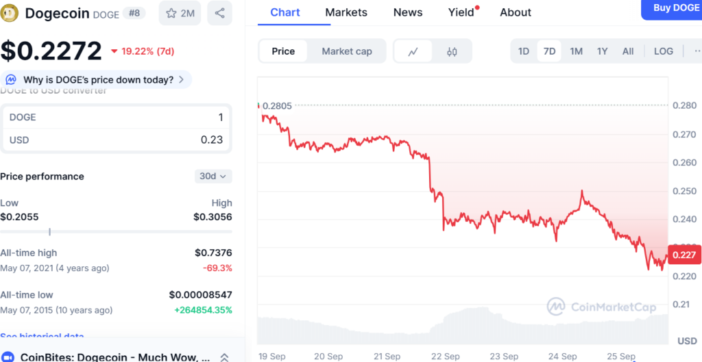 Dogecoin (DOGE) has also experienced massive price fluctuations. DOGE is down 19.22% in the past week, with a current price of $0.2272. Despite brief rallies, the overall downtrend indicates investor anxiety. Since Dogecoin is mainly driven by speculation and lacks other use cases, it is highly vulnerable to sharp price swings, with many investors reassessing their holdings for better opportunities like LILPEPEPE.