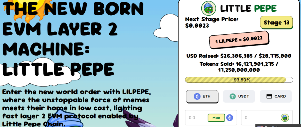 Unlike Shiba Inu or Dogecoin, Little Pepe’s ($LILPEPE) Layer 2 blockchain is catching the attention of crypto investors due to its ability to enable faster transactions with zero tax on trades. This feature and token utility in staking and NFTs position $LILPEPE for growth. LILPEPE’s current price is $0.0022, and it is in Stage 13 of its presale. This stage is nearing its end, and the upcoming price increase to $0.0023 has already been confirmed, indicating a move to Stage 14. At the time of writing, they have raised $26.3 million and sold 16.1 billion tokens. Only 6.5% of presales remain, making it an urgent time to invest.
