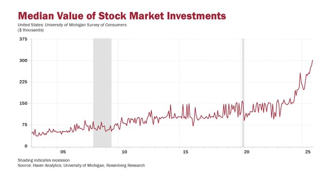 Rosenberg noted that consumer sentiment is now lower than during the troughs of all eleven U.S. recessions since the 1950s, even as stock portfolios swell to historic highs. The contrast, he suggested, points to an economy increasingly reliant on inflated asset values rather than genuine income growth.