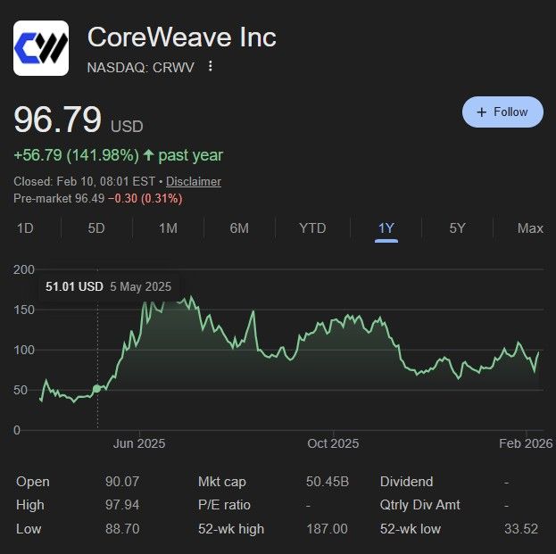 At the time of publication, CoreWeave stock prices sat at $96.79, up 141.92% the past twelve months.
