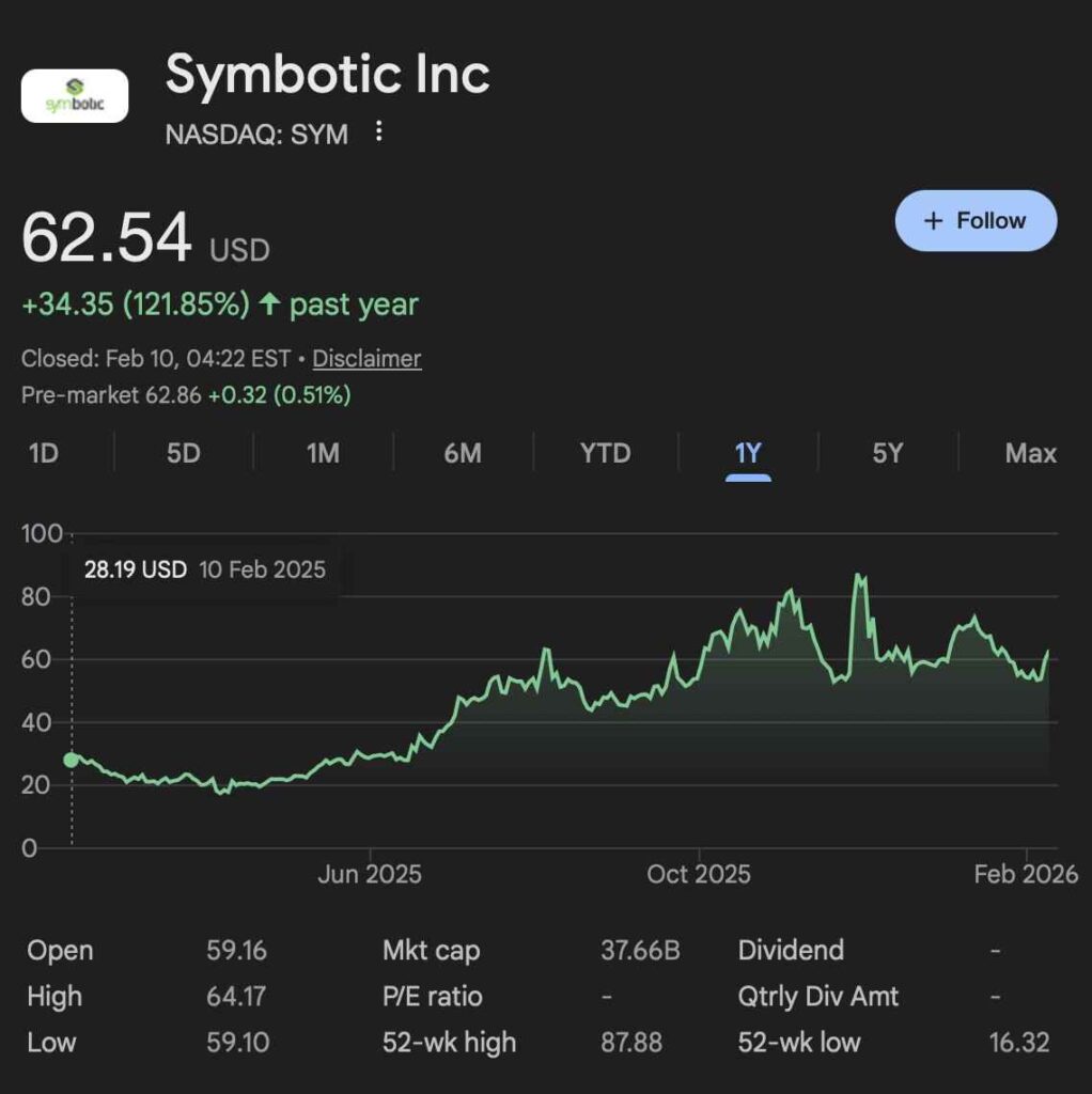 Symbotic (NASDAQ: SYM) is positioning itself as a dominant force in warehouse automation, building fully autonomous, AI-powered robots that handle sorting, storage, and retrieval of goods.