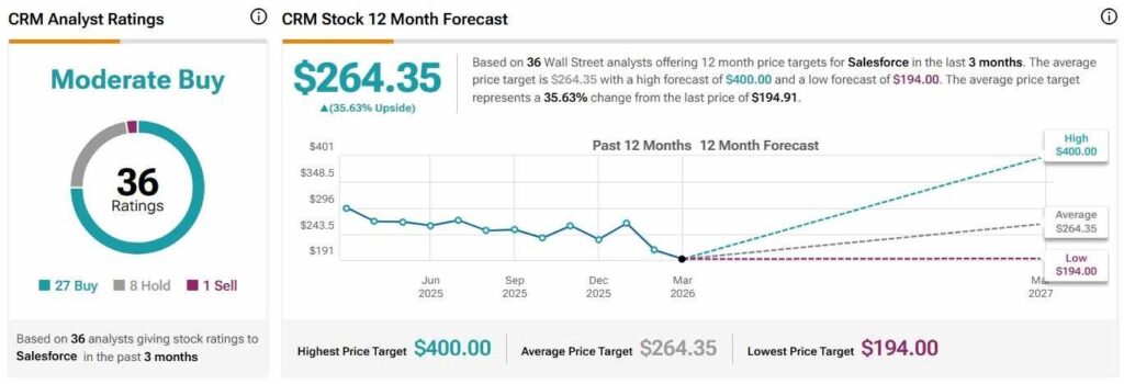 So far, CRM is 13.15% in the red in 2026 but has risen 0.11% in the last 30 days of trading to its March 11 press time price of $194.25.