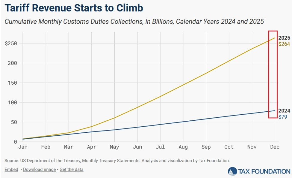 December alone generated $28 billion in tariff revenue, roughly 300% higher than the same month a year earlier and about $21 billion more year-on-year.