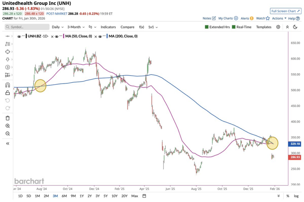 Notably, the gold cross follows a near-historic drawdown, with UnitedHealth trading around $287, down from 2024 highs above $550, representing a peak-to-trough decline of roughly 48%.